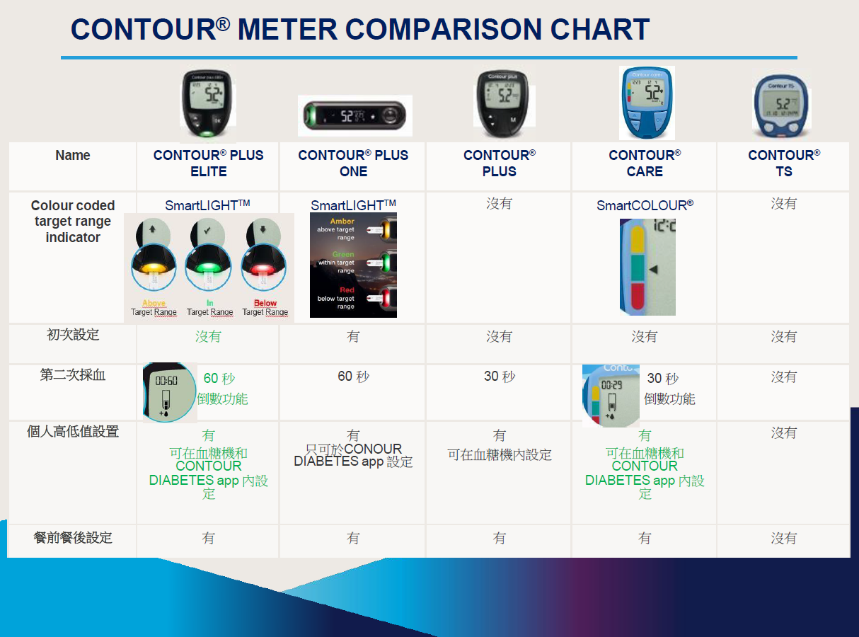 - smartCOLOUR™功能:以三色指示即時為您顯示血糖測試結果是否在目標水平範圍 (綠色 = 在目標範圍內 黃色 = 高於目標範圍 紅色 = 低於目標範圍)